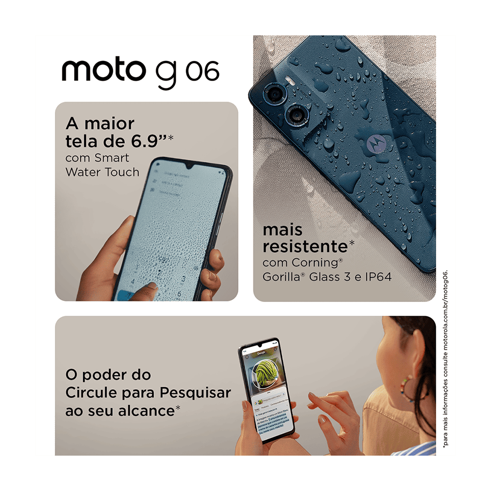 As vendas do Moto G06 já começaram no Brasil nas lojas oficiais da Motorola, quiosques e redes parceiras. Os preços oficiais são: